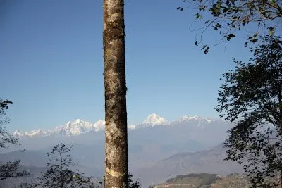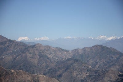 Wir sehen die Berge. Es ist immer so schön die Berge zu sehen. Wie sie in der Ferne alles überragen. Himalaya.